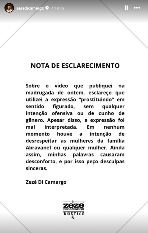 "Sobre o vídeo que publiquei na madrugada de ontem, esclareço que utilizei a expressão 'prostituindo' em sentido figurado, sem qualquer intenção ofensiva ou de cunho de gênero. Apesar disso, a expressão foi mal interpretada", iniciou Zezé.