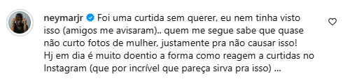 “Foi uma curtida sem querer, eu nem tinha visto isso (amigos me avisaram).. quem me segue sabe que quase não curto fotos de mulher, justamente pra não causar isso! Hoje em dia é muito doentio a forma como reagem a curtidas no Instagram (que por incrível que pareça sirva pra isso)”, escreveu.